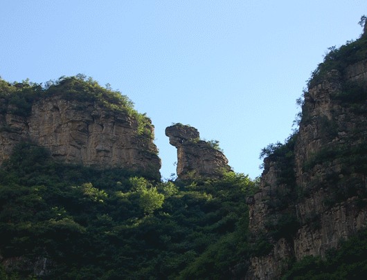關於十渡旅遊去看孤山寨内各個地質奇觀,都有一段傳奇的寓言故事,其中在十渡孤山寨就有一段陳香劈山救母的故事。陳香劈山救母留下瞭孤山寨一線天的絕妙景觀。但是在陳香劈山救母的過程中,還有一段小插曲:陳香劈山救母時,楊二郎的哮天犬前竄後跳的給陳香添瞭不少麻煩。那條二郎神的天犬跟他主子一樣無情無義,因此激怒瞭陳香,惹得妹妹楊青才翻瞭臉,楊二郎卻忘瞭兄妹之情,把其妹壓在大山之下,陳香救母心切,哪還顧得許多,誰來阻止他救母就是他的敵人。所以,當那條哮天犬來搗亂時,陳香滿腹仇恨凝集在斧刃之上,三下五除二把那隻效忠它主子的天狗踩在地上,舉斧剁去,将狗剁成三截。剛才兇神一般的惡犬,頓時蔫在地上,他的主子見此情景,氣呼呼的回到灌江口,他跟随多年的哮天犬也丢在瞭孤山寨。陳香也給他留瞭一條活路,讓它看守天門,閉目思過。於是那隻在天空不可一世的哮天犬變成瞭一塊犬形石,知道如今,還乖乖地守候在孤山寨頂峰的山梁上,尾巴分爲三段,遠遠望去,活靈活現。