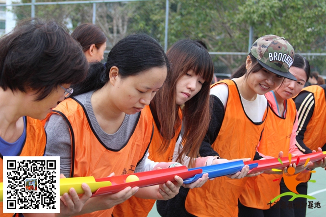 所有隊員一字排開,手持接力棒,在保證圓珠不掉落的情況下從(cóng)拓展培訓教練指定的位置運珠到達(dá)終點。